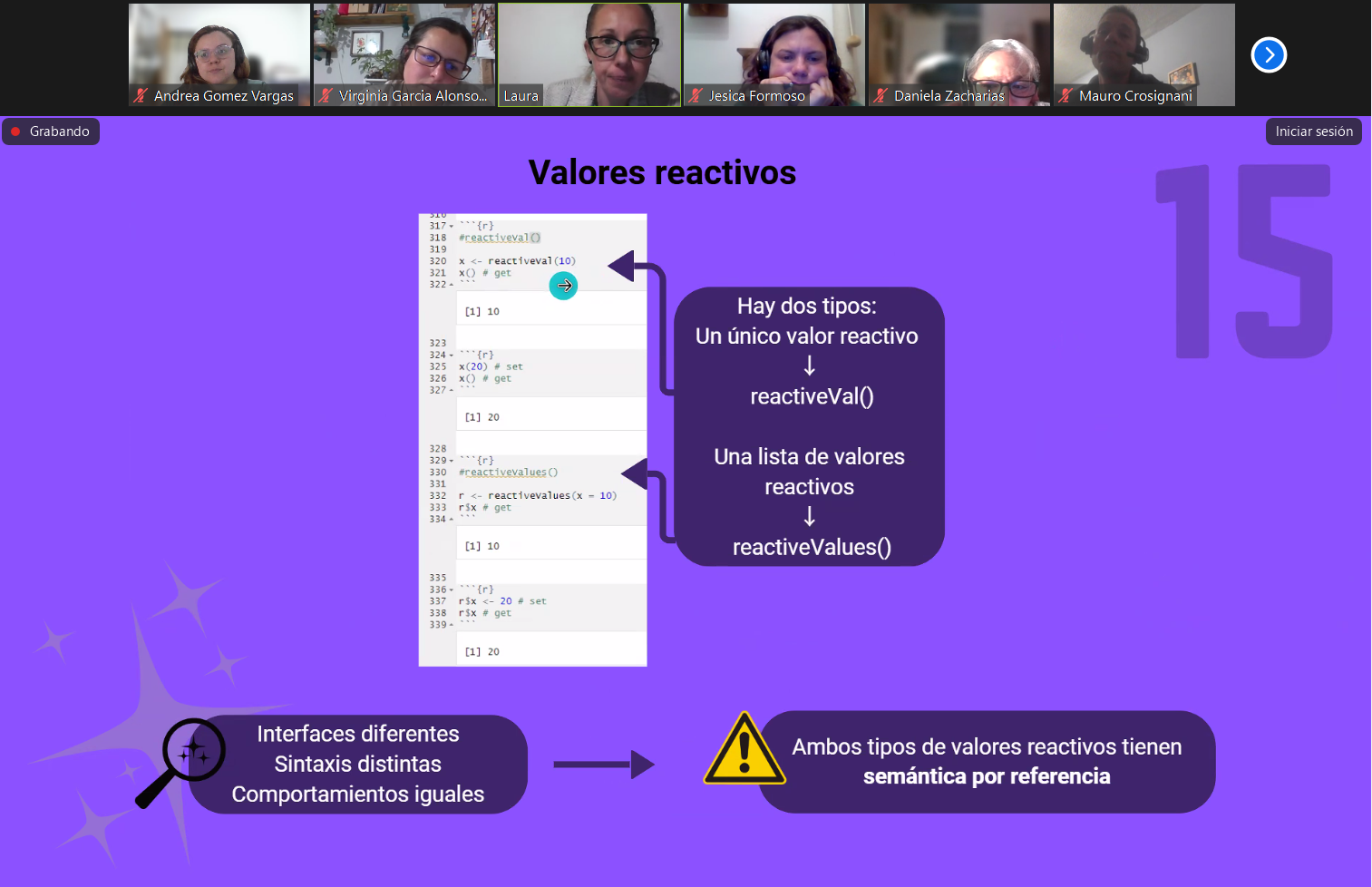 No se esperaba que nadie fuera experto. De hecho, alentamos explícitamente a personas con poca o ninguna experiencia previa en Shiny a participar y a liderar (¡y lo hicieron!). La única pauta era leer los capítulos, intentar los ejercicios y venir dispuestos a compartir. Las personas presentadoras explicaban lo que habían entendido de los capítulos, destacaban los conceptos clave y nos guiaban a través de los ejercicios. ¡Luego ocurría la magia! Entre todos completábamos los vacíos, hacíamos preguntas, proponíamos alternativas y aprendíamos unos de otros.